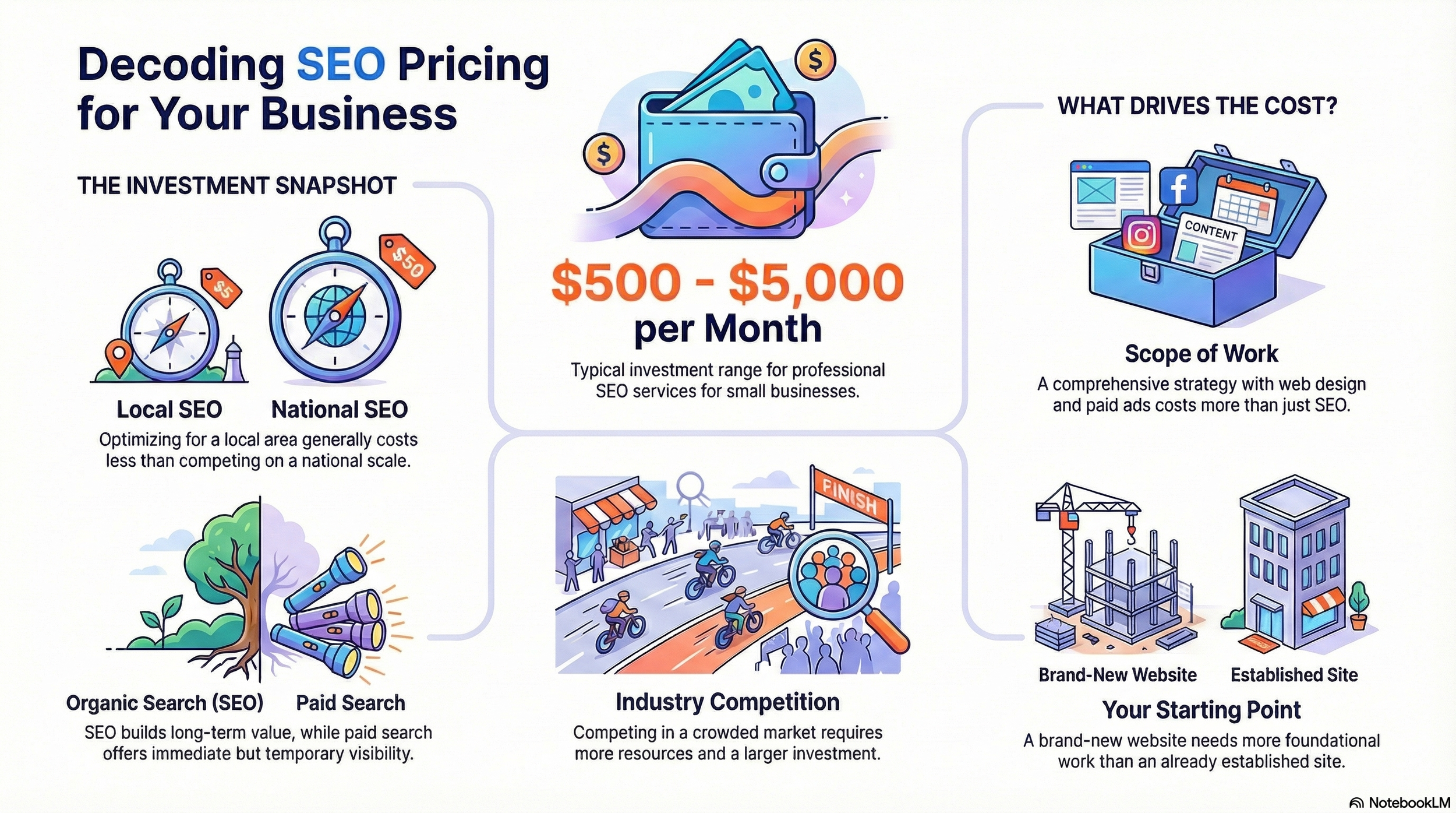 The truth is, SEO pricing in 2026 varies widely, and understanding why helps you make smarter decisions for your business. Most small businesses invest anywhere from $500 to $5,000 per month for professional SEO services. That's a big range, right? The price you pay depends on what your business needs, where you are competing, and how quickly you want results.
